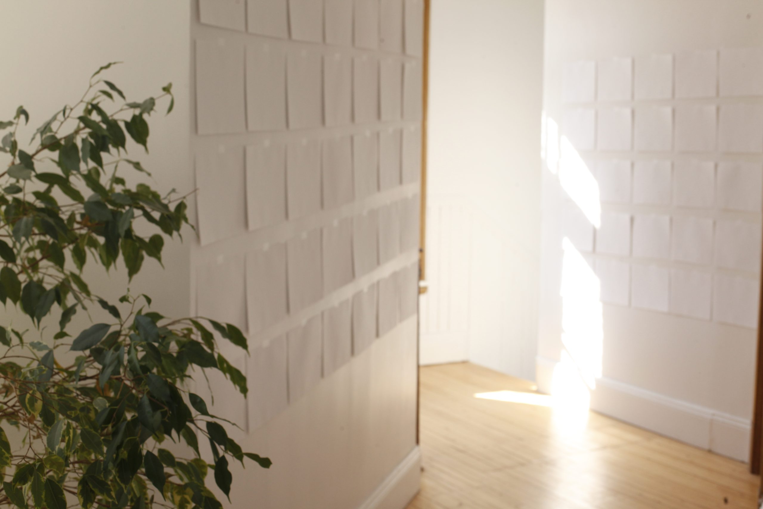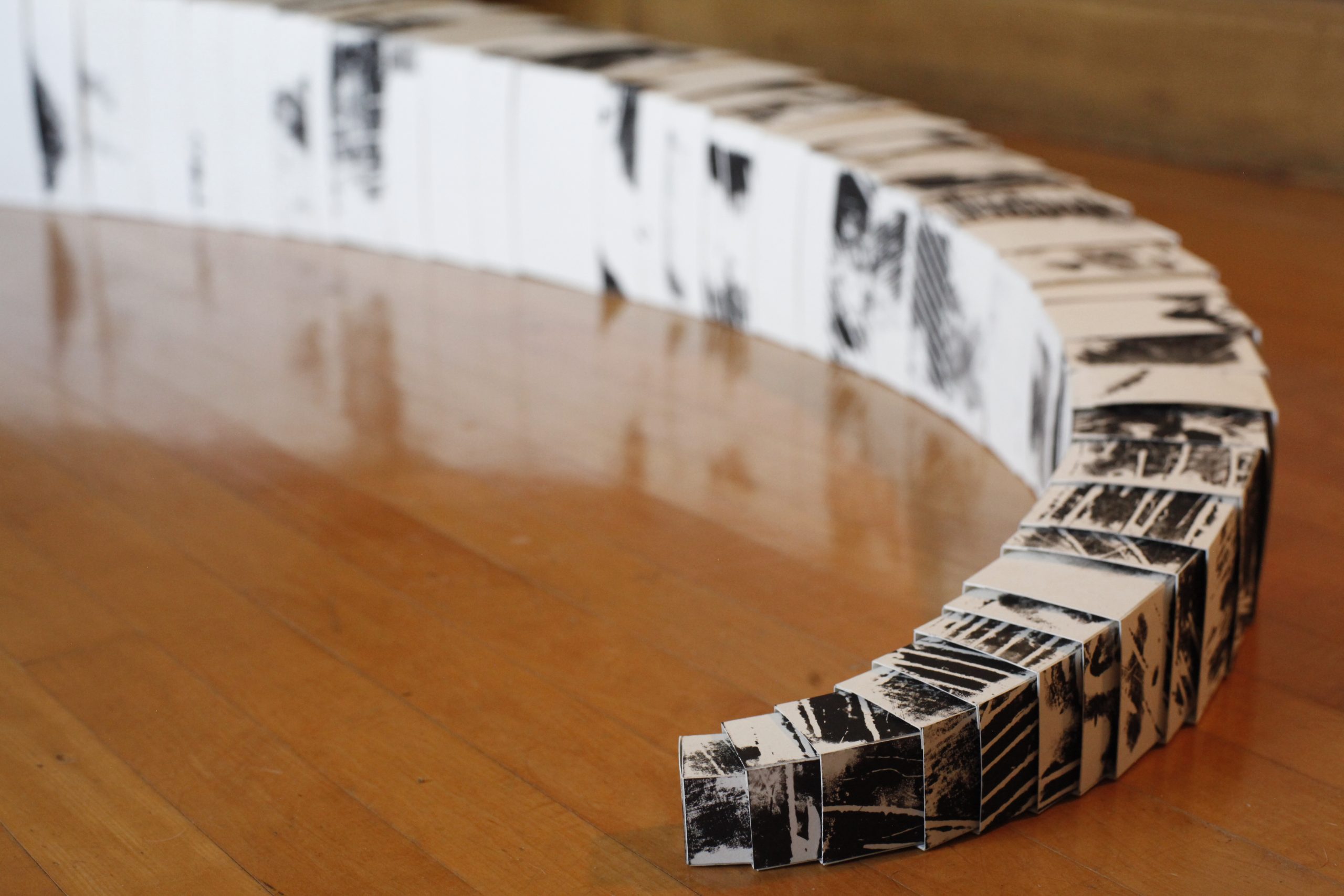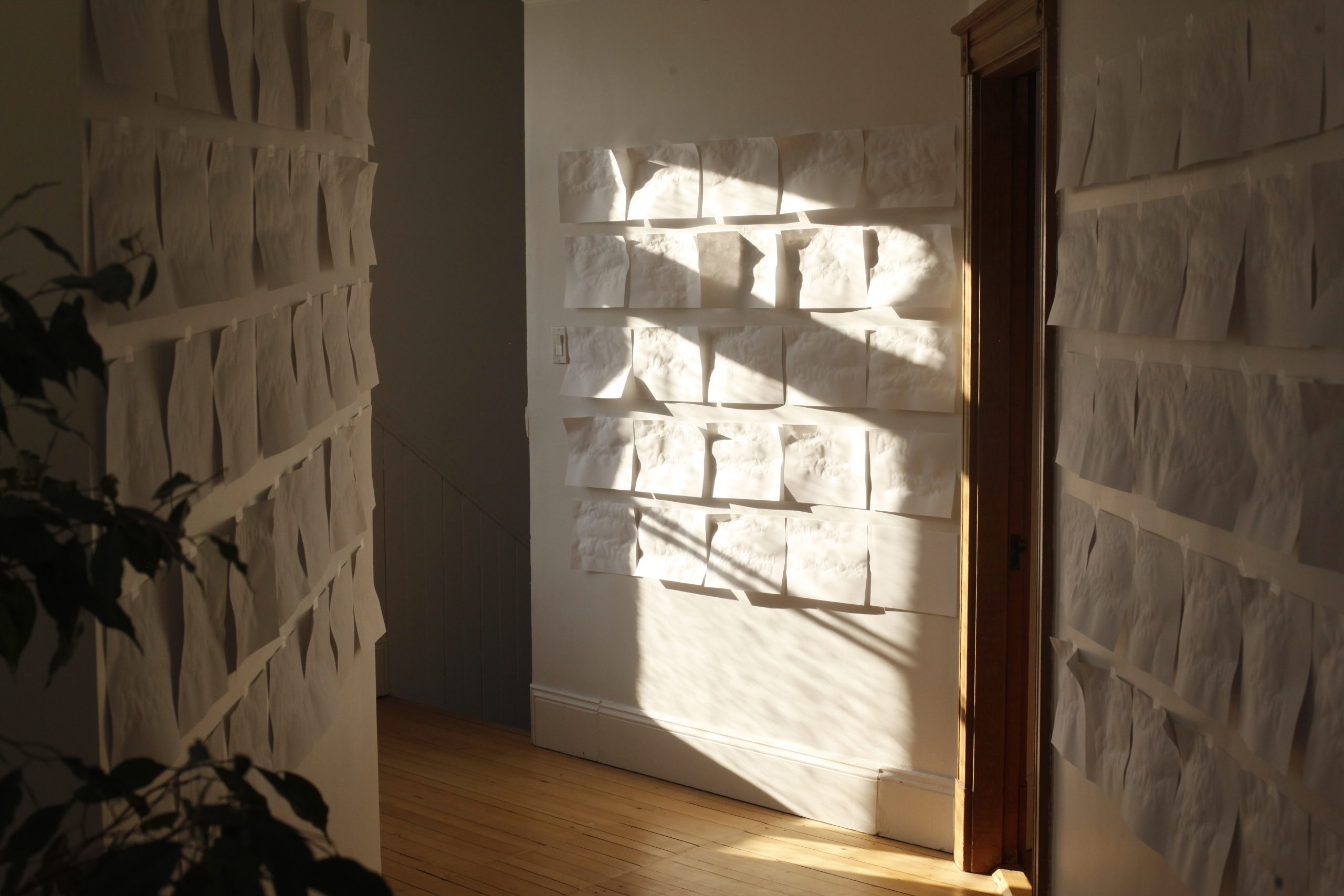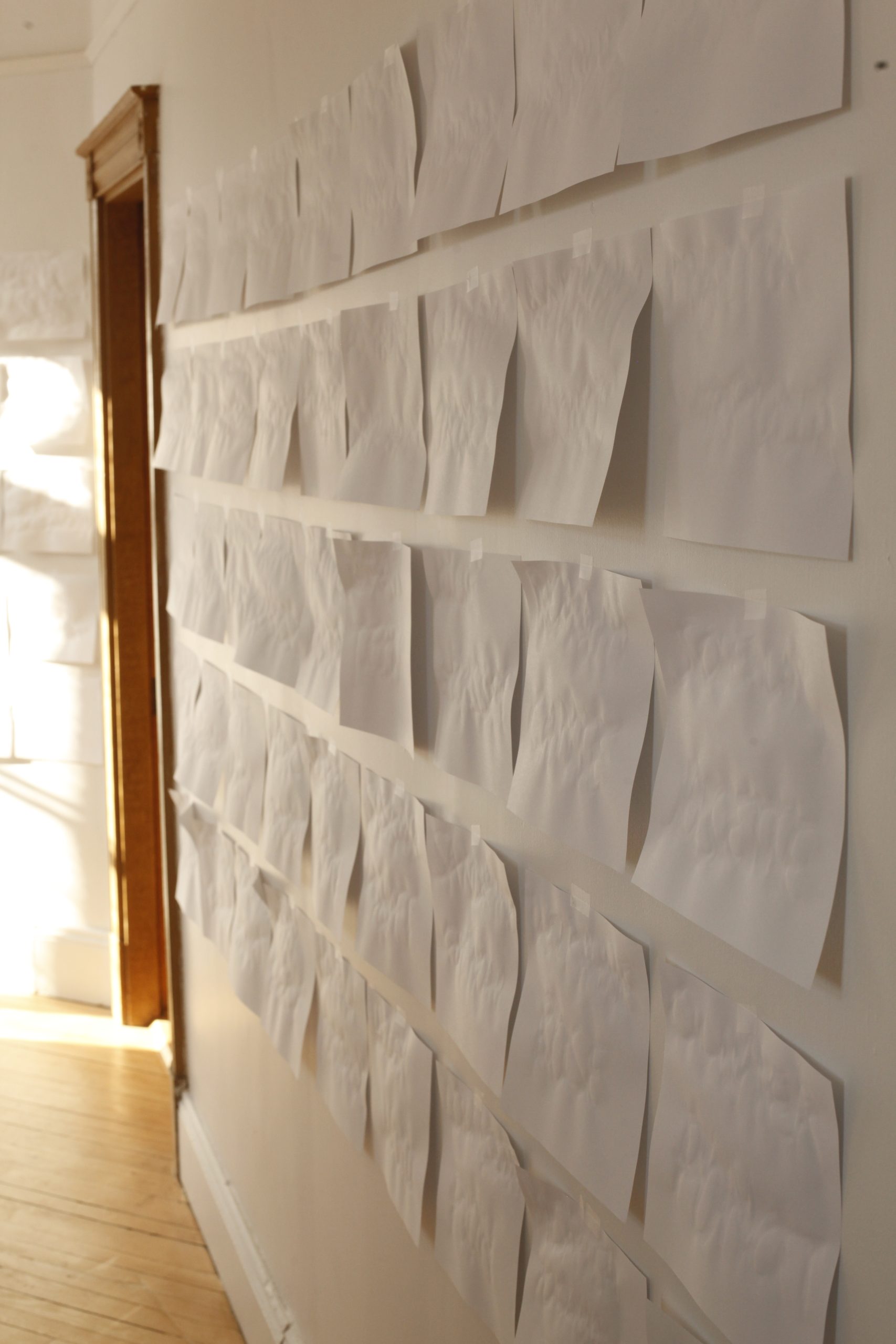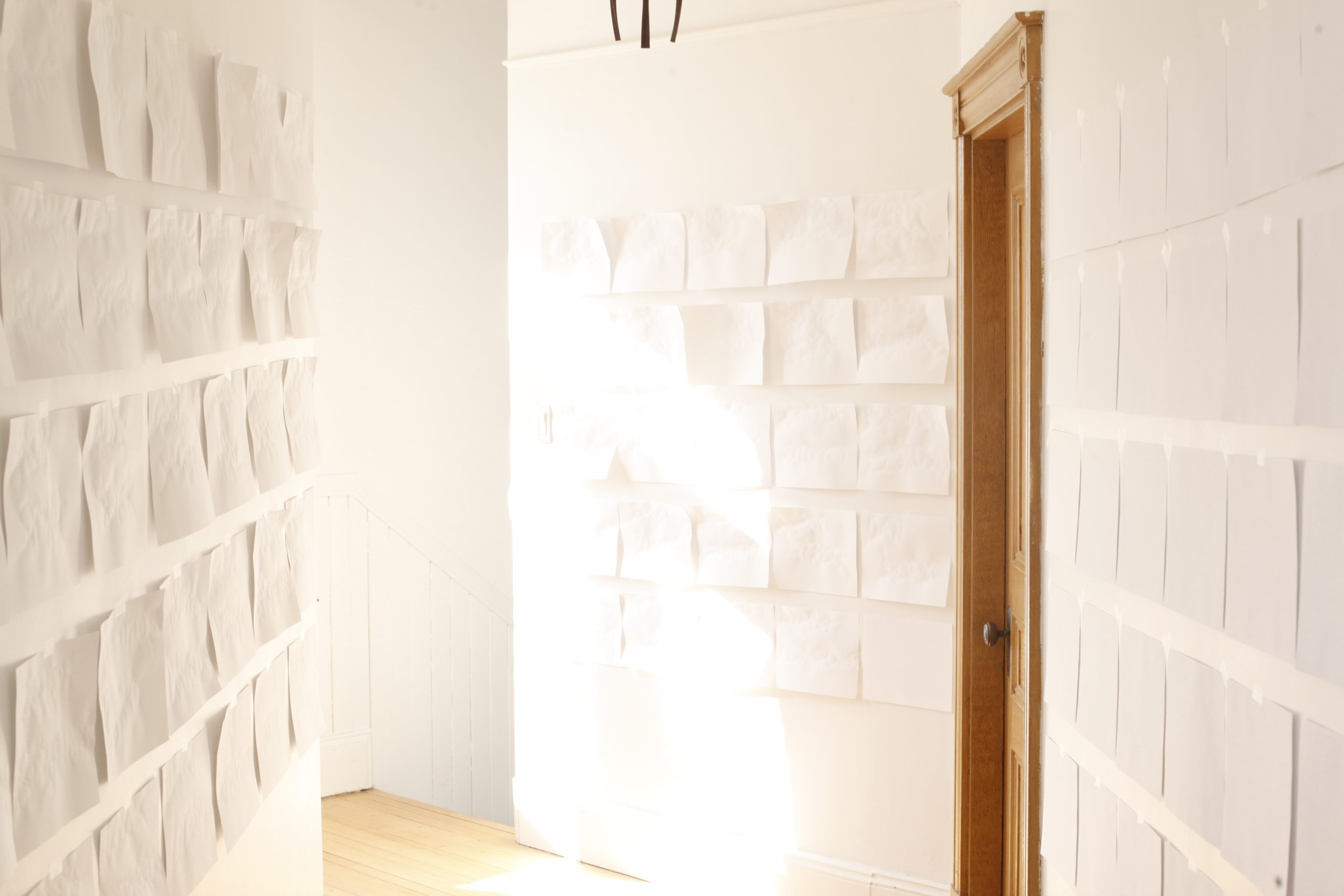 100 Eux, c’est une performance minimaliste. Papier d’imprimante, eau, pinceau. Se souvenir avec le geste : écrire les noms de cent personnes qui ont compté et qui sont absents. Pas de liste, un vrai effort de mémoire. L’écriture à l’eau est invisible, mais au séchage, chacune des cent feuilles qui se recroquevillent de façon unique.