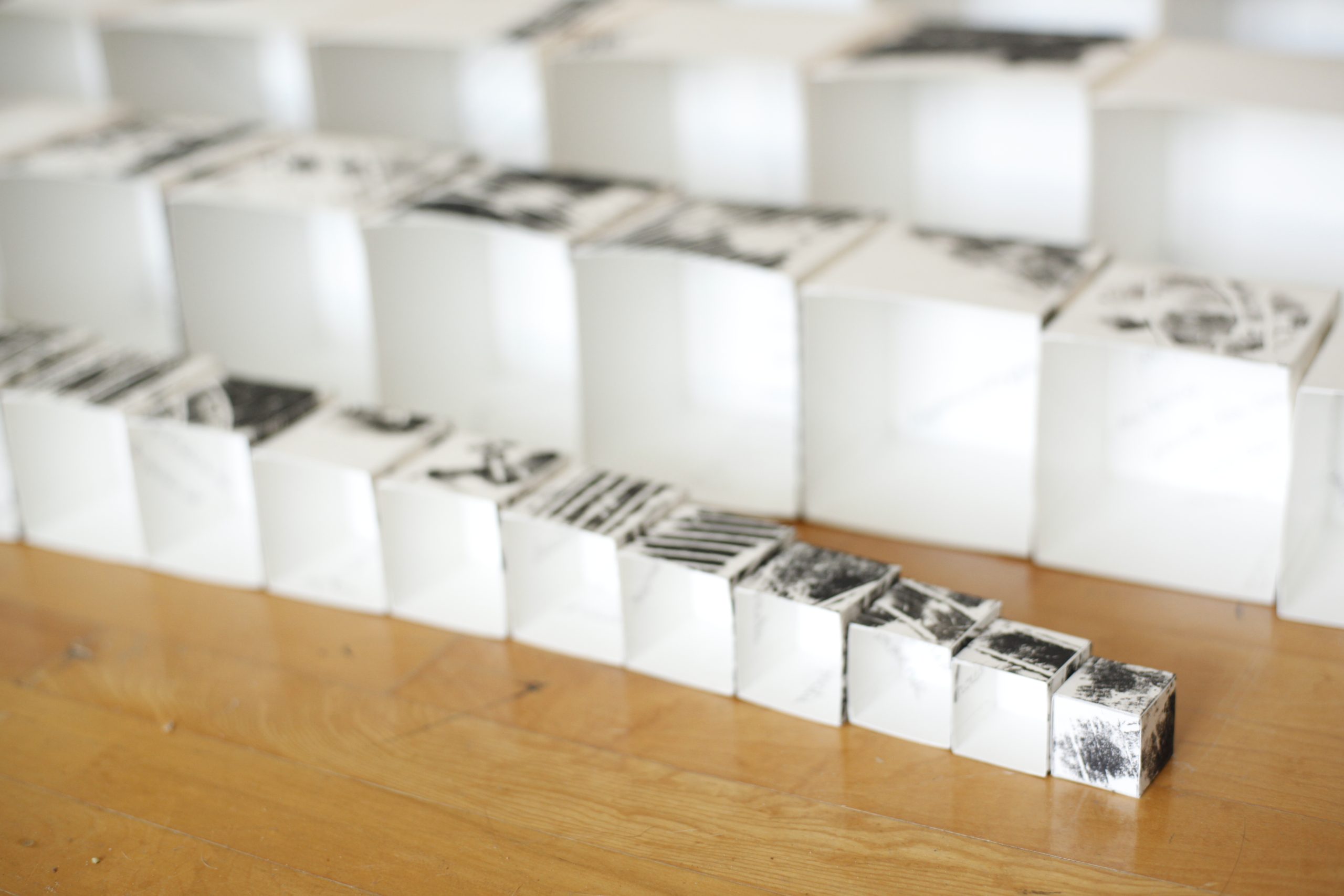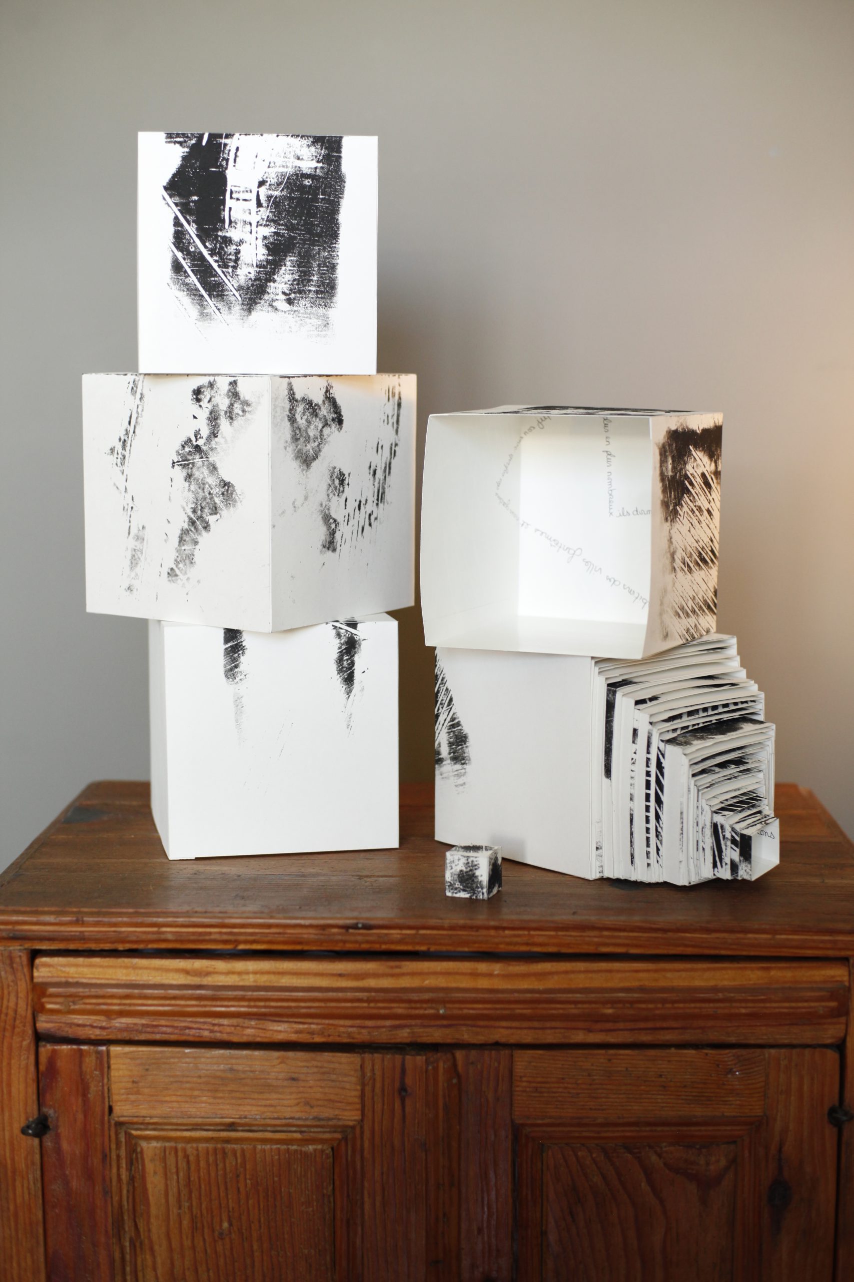 Chaque cube a été individualisé à l’encre noire par xylogravure. Ce procédé a permis d’apposer sur chaque module une image évoquant l’un des quatre éléments (l’eau, la terre, le feu et l’air) et ses forces transformatrices.