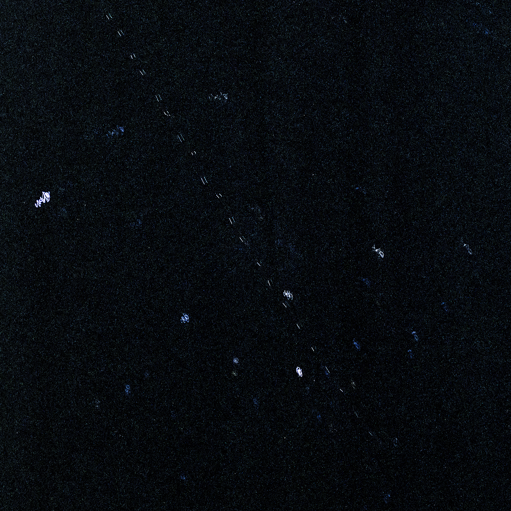 En l’occurence, le bateau est soumis aux mouvements du fleuve qui deviennent visibles sur la photographie. En outre, la photographie argentique vient avec son lot d’imperfections. Les couleurs du jours levant sont altérées et la photographie devient un entre-deux entre réel et fiction, entre figuratif et abstraction. La nuit est quant à elle peuplée par le « bruit » argentique, qui sème la confusion en apportant à l’image ses propres constellations. Les étoiles, soumises à la vibration de la caméra, laissent des traces semblables à des galaxies.
