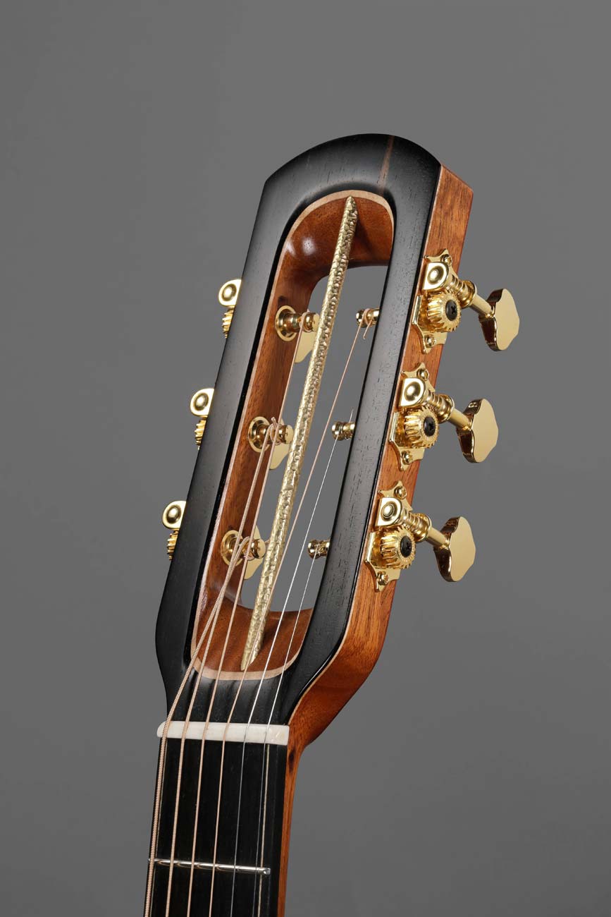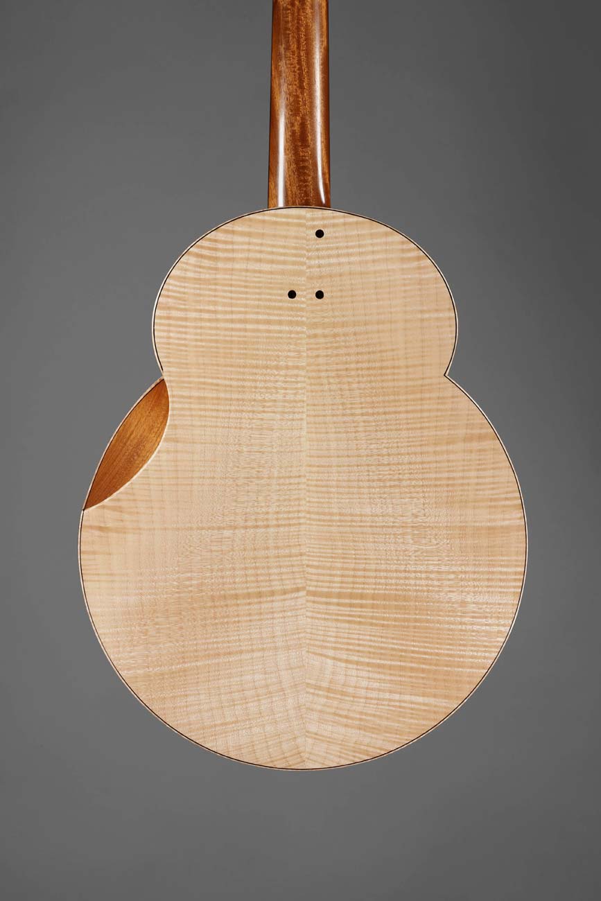 Ma quatrième guitare, réalisée à l’École Nationale de Lutherie de Québec, est un instrument résolument contemporain. Inspiré par le travail de grands luthiers tels que Ken Parker, Michihiro Matsuda, Thierry André, Kopo (Fred Pons) ou encore Georges Lowden, j’ai naturellement intégré ces influences lors de la conception de cet instrument. Cette guitare est également proche de la Beetle de Jacky Walraet (guitare que j’ai découvert par après, et à laquelle j’ai emprunté le chanfrein ergonomique). Le dessin général repose sur l’idée d’une simplification des formes : la silhouette de la caisse est réduite à un cercle et une ellipse. Le travail sur les contrastes et les couleurs s’appuie uniquement sur la sélection et l’agencement des matériaux (bois, os, métal), la finition étant transparente.